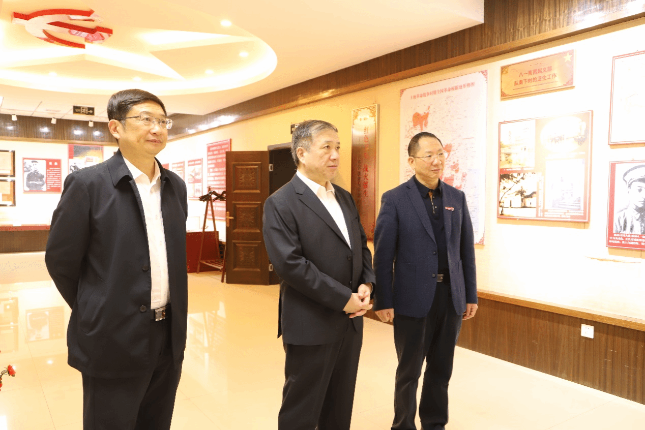 杨振斌首先到学校红色卫生史博物馆参观,认真聆听中央苏区红色卫生事业的奋斗历程,驻足端详珍贵的历史文物、文献手稿,对我校结合专业特色,立足赣南红色沃土,深挖红医历史内涵,构建红医精神育人体系的做法给予高度赞扬。