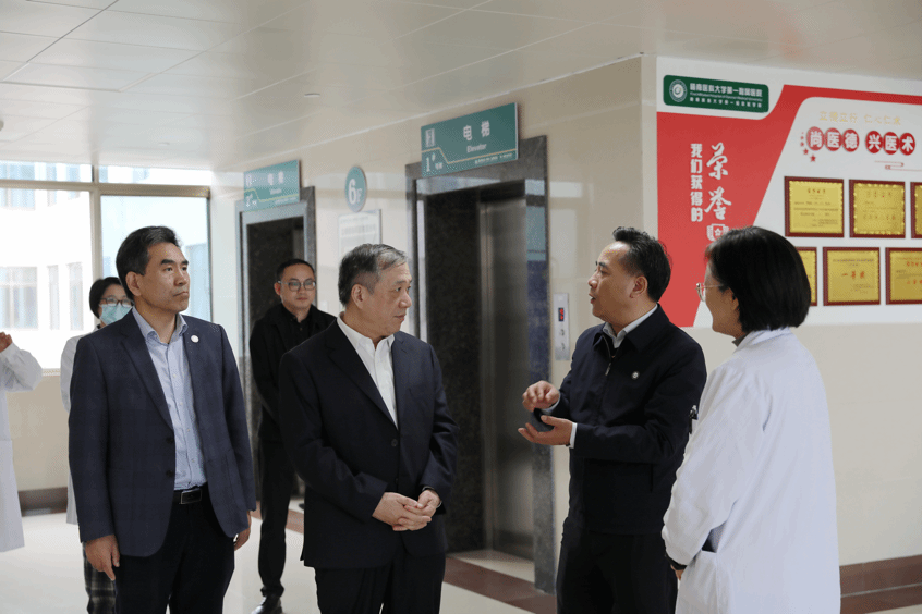 之后,杨振斌一行到我校一附院黄金院区调研,参观了院史馆、全科医学科、精准医学中心,以及国家临床教学培训示范中心、并开展座谈交流。杨振斌高度肯定了我校一附院(第一临床医学院)取得的成就,并介绍上海交通大学的发展现状。双方表示,将以此次交流为新起点,共同探索卓越医学创新人才培养新模式,为推动医学教育高质量发展、服务健康中国建设作出新的更大贡献。