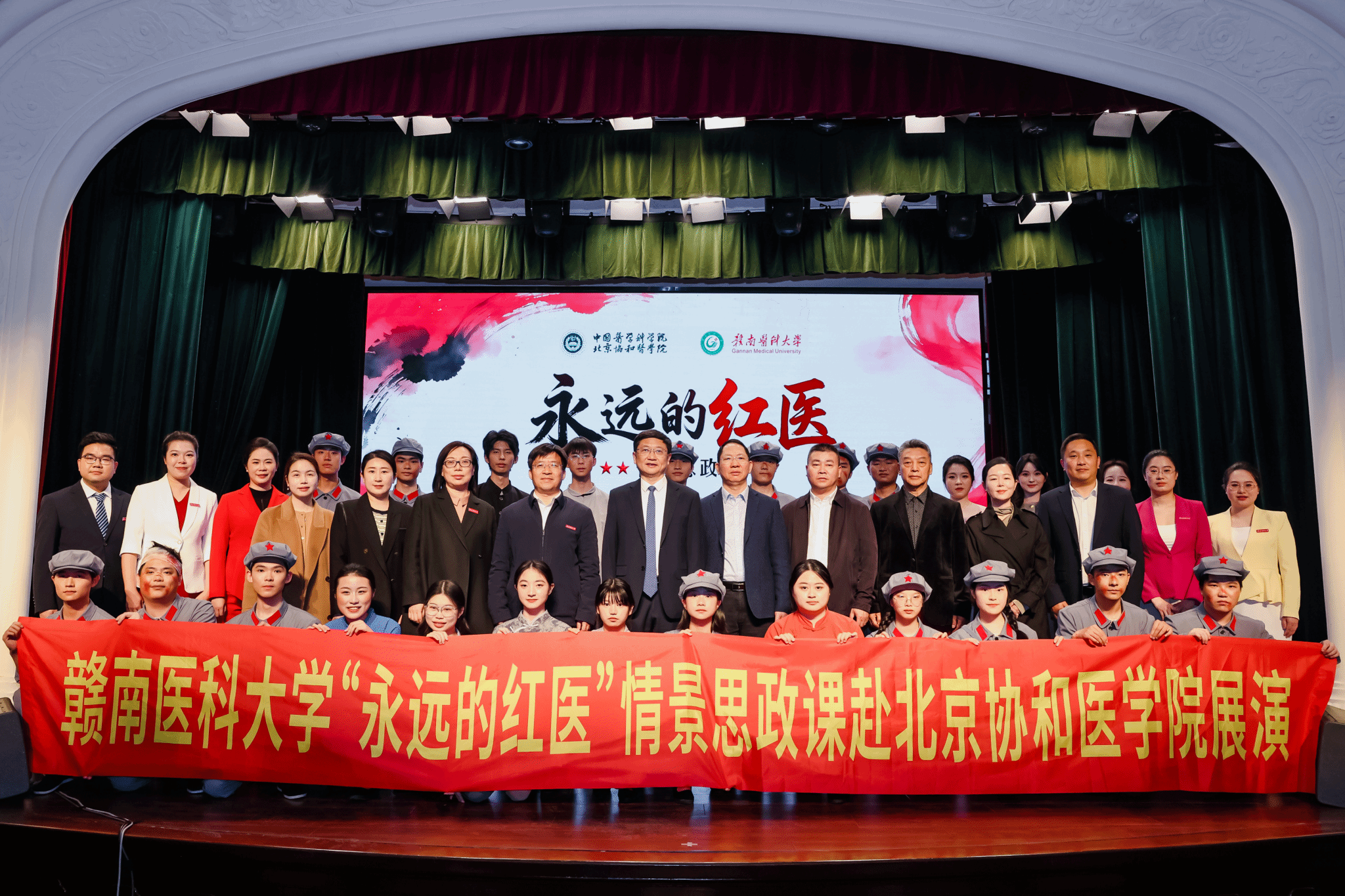 近日,赣南医科大学原创情景思政课“永远的红医”先后走进北京协和医学院、北京大学医学部、天津医科大学,完成北京、天津高校巡回展演。课程以“师生同台+艺术演绎”模式,再现贺诚等红医先辈在中央苏区的感人事迹,将“政治坚定、技术优良”的红医精神化为沉浸式教材,三场展演均获兄弟院校师生高度评价。北京、天津两地校友代表随邀观看。