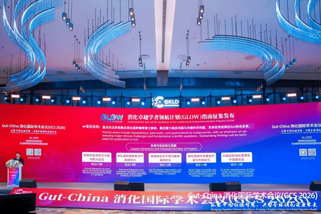 开幕式上,《Gut》与重大疾病新药靶发现及新药创制全国重点实验室(SKLD)联合发布了“消化卓越学者领航计划(GLOW)”指南征集。李红良教授与Emad El-Omar教授,以及《Gut》主编Matias A. Avila教授、William M. Grady教授、Thomas Rösch教授共同启动该计划。项目重点关注肝胆胰及消化道肿瘤等重大疾病,解决重大临床问题与关键科学问题,支持优秀成果在《Gut》杂志发表。首批支持5个前沿方向:肝损伤新靶点与新药物、消化道肿瘤机制与干预、肠道微生态与消化道疾病调控、胃肠疾病中多器官对话研究、AI驱动的胃肠疾病新药研发,拟立15-20个项目。申报系统于2026年3月21日正式开放,截止日期为2026年4月20日。