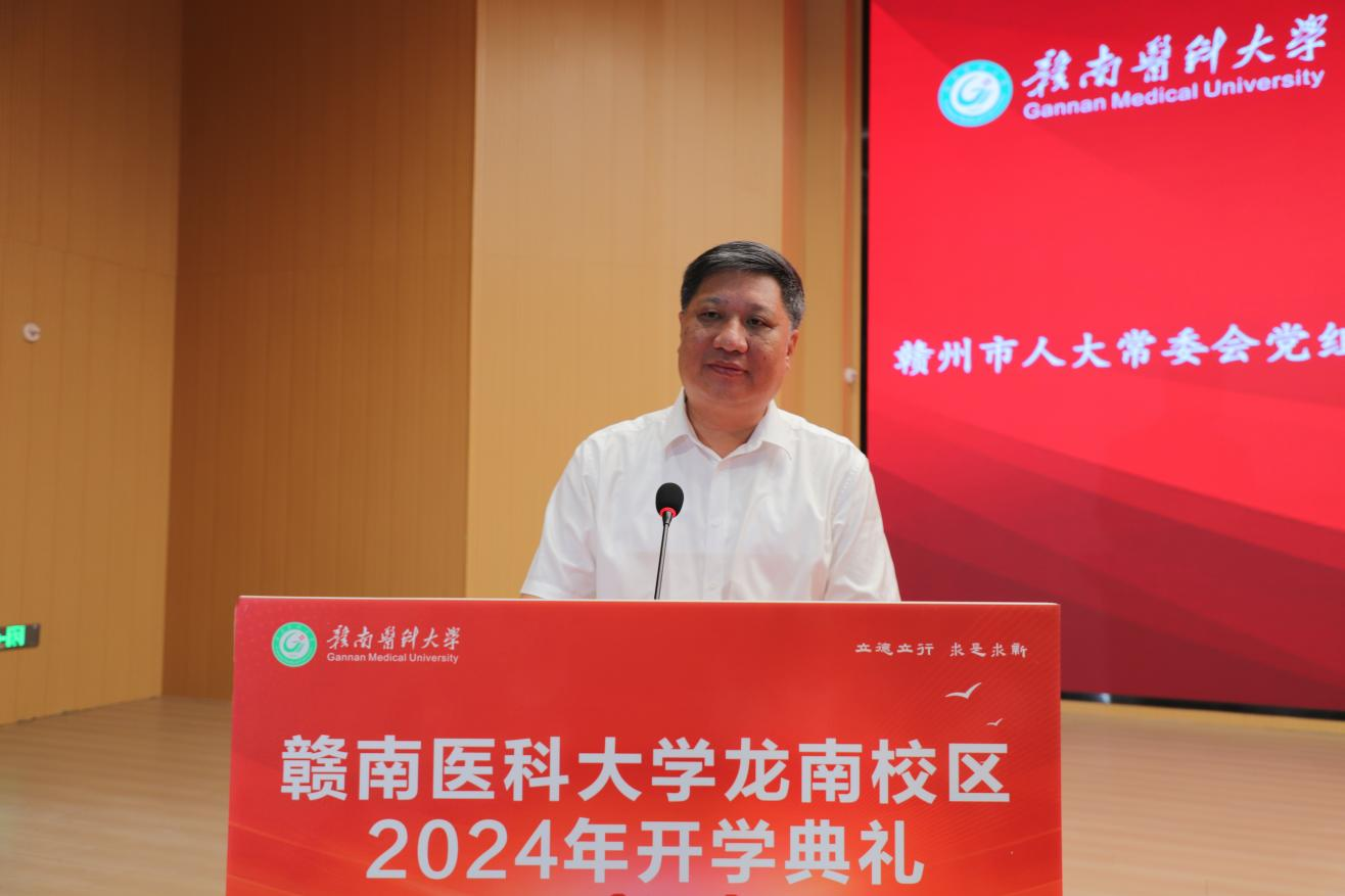 钟旭辉代表龙南市委、市政府以及龙南人民,向师生们表示热烈欢迎。他指出,赣南医科大学龙南校区的建成开学,标志着龙南拥有了第一所公办本科院校,是龙南人民期盼已久、为之振奋、倍感自豪的盛事喜事。希望同学们立凌云志、读万卷书,去浩瀚的书海中汲取知识的力量,在大学岁月里绽放青春的光芒,努力成为学有所长、业有所专、技有所精的新时代医学新人,期盼大家把龙南视作故乡、把赣医当作家园,根植这片热土、践行医者仁心,与龙南双向奔赴,共同为未来拼搏。