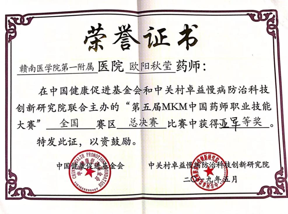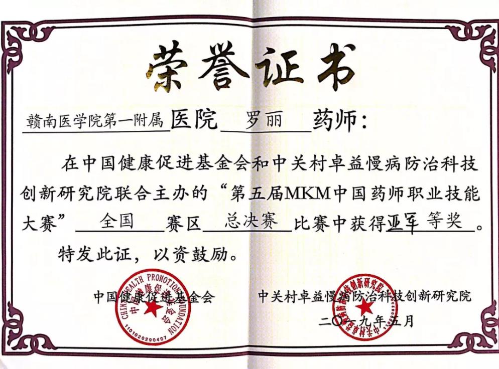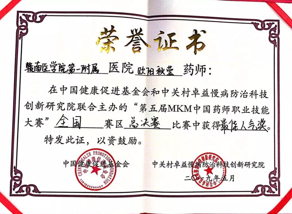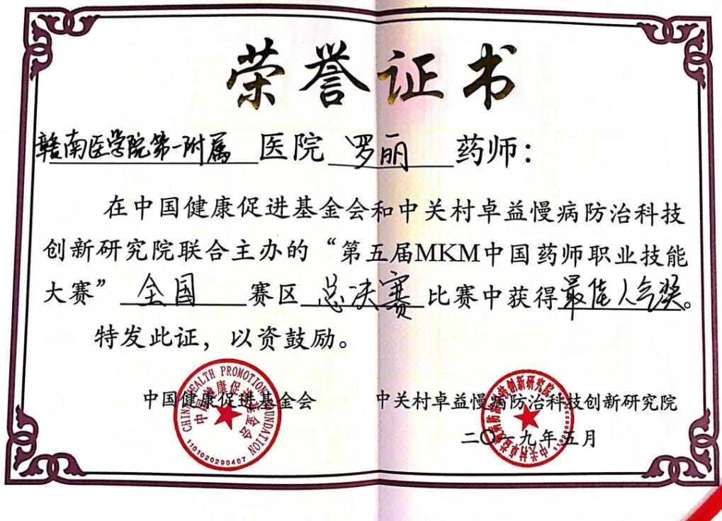 奋斗的青春最美丽!2019年5月4日,在全国上下庆祝五四运动100周年之际,由中国健康促进基金会、中关村卓益慢病防治科技创新研究院联合主办的第五届MKM中国药师职业技能大赛总决赛在北京九华国际会议中心隆重举行,来自全国各地东西南北四个区域共14支代表队(28名选手)参加总决赛角逐。我院代表队罗丽、欧阳秋莹两位选手在14支队伍中脱颖而出,以85.38分(总分106分)的成绩斩获亚军,我院网络投票人气稳居第一,获得“最具人气奖”荣誉称号。这是南方七省唯一获此佳绩的代表队。