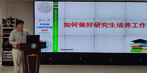 曹健院长和张进平副院长分别作了《夯实基础,提高质量——学位与研究生教育改革及思考》和《如何做好研究生培养工作》的专题报告。两位教授分别从宏观和微观的角度,详细介绍了苏州大学研究生教育的发展历程、改革措施和成效、学科建设思路、未来布局,分享了博士、硕士研究生培养的成功经验。