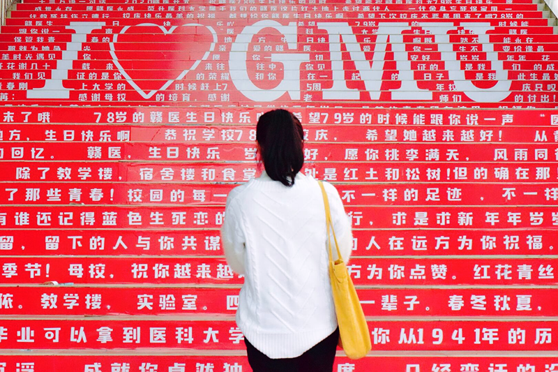 黄金校区食堂的一条“网红”楼梯成为建校纪念日里一道亮丽的风景线,那是同学们用征集来的师生祝福做成的地贴,喜庆的红色和节日的气氛相互烘托,引得路人纷纷驻足拍照打卡。