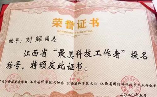 近期,由省委宣传部、省科协、省科技厅、省国防科工办联合开展的2020年江西省“最美科技工作者”评选揭晓,赣州市第五人民医院院长刘辉被授予2020年江西省“最美科技工作者”提名称号。