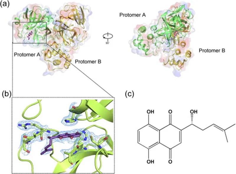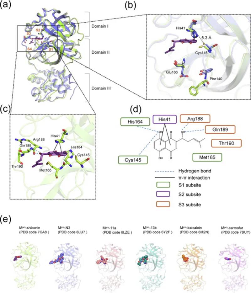 本文揭示中药活性成分紫草素抑制新冠病毒主蛋白酶的分子机制,发现紫草素在结合口袋的结合方式非常独特,不同于现有的小分子抑制剂结合模式,对于针对主蛋白酶这一靶点的药物研发可能有重要意义。