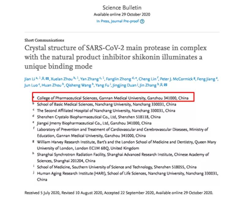 10月29日,药学院李健博士联合南昌大学张进博士在Science Bulletin (影响因子:9.5,一区)上在线发表了题为“Crystal structure of SARS-CoV-2 main protease in complex with the natural product inhibitor shikonin illuminates a unique binding mode”的论文。