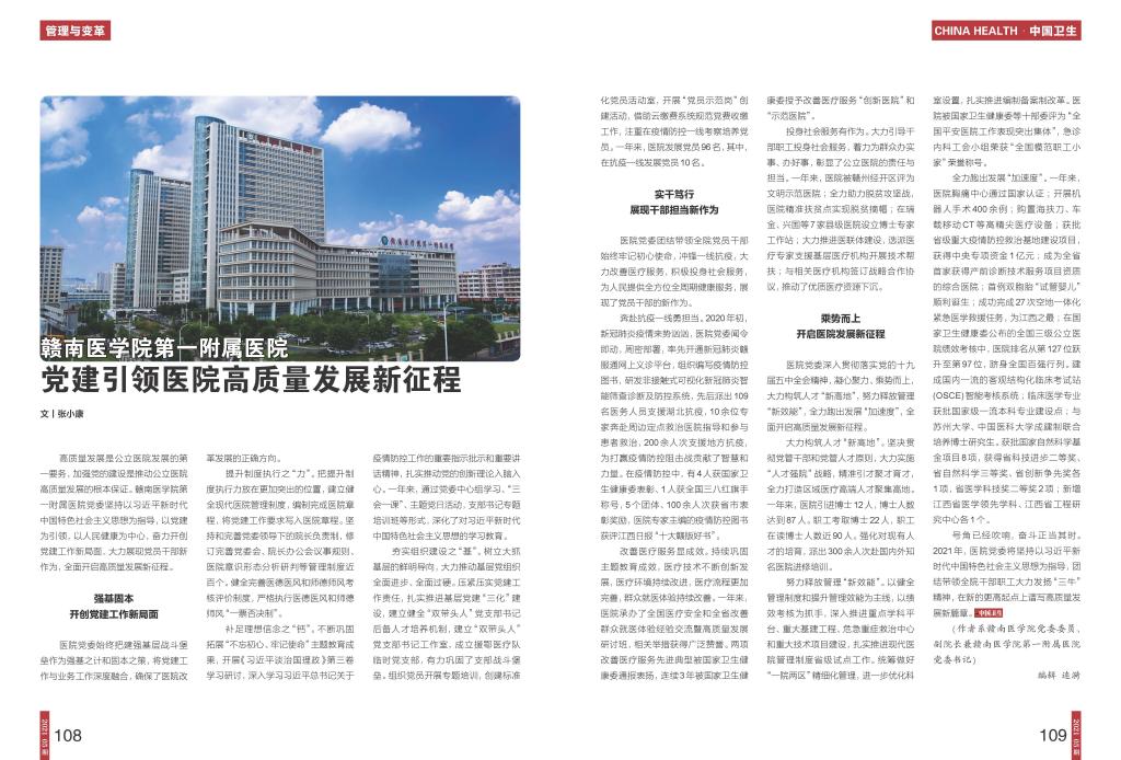 国家卫生健康委主管的《中国卫生》杂志2021年(5月)第5期刊发了我校党委委员、副校长兼第一附属医院党委书记张小康的署名文章《党建引领医院高质量发展新征程》。