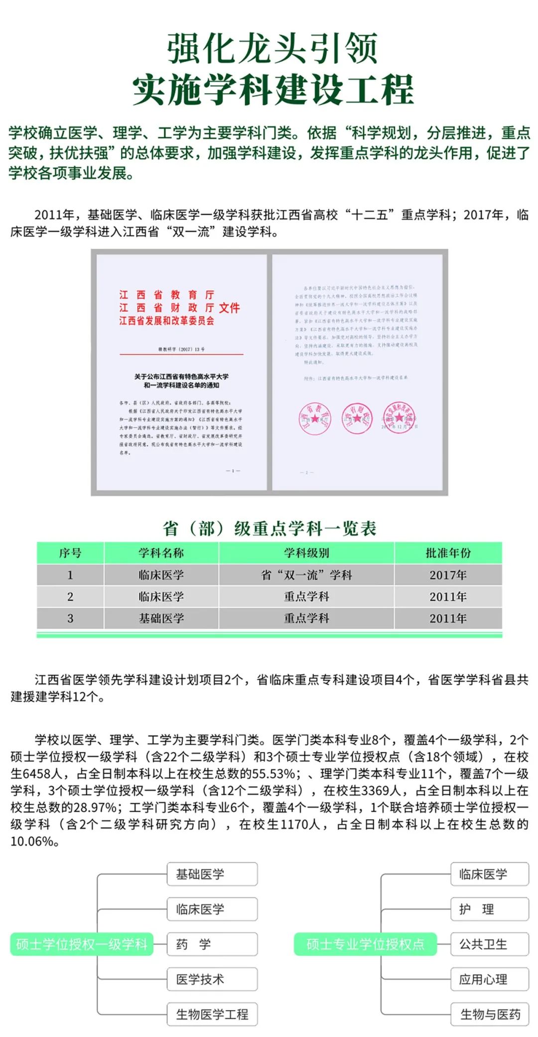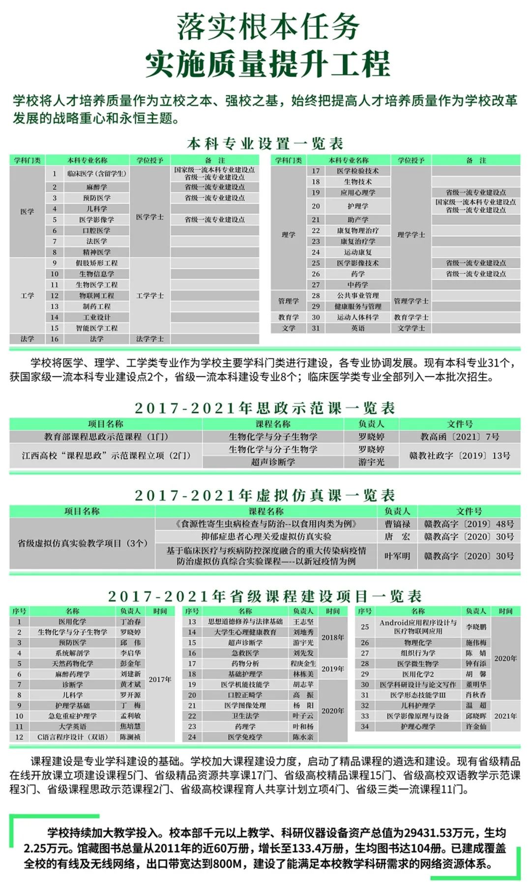 1958年建成赣南医学专科学校,1988年升格为赣南医学院,2013年获硕士学位授予权。80年来,学校始终扎根老区、面向基层、服务百姓,承载着为人民群众解除疾患的初心使命,培养了9万余名医学专门人才,为呵护人民群众身心健康作出了重要贡献。