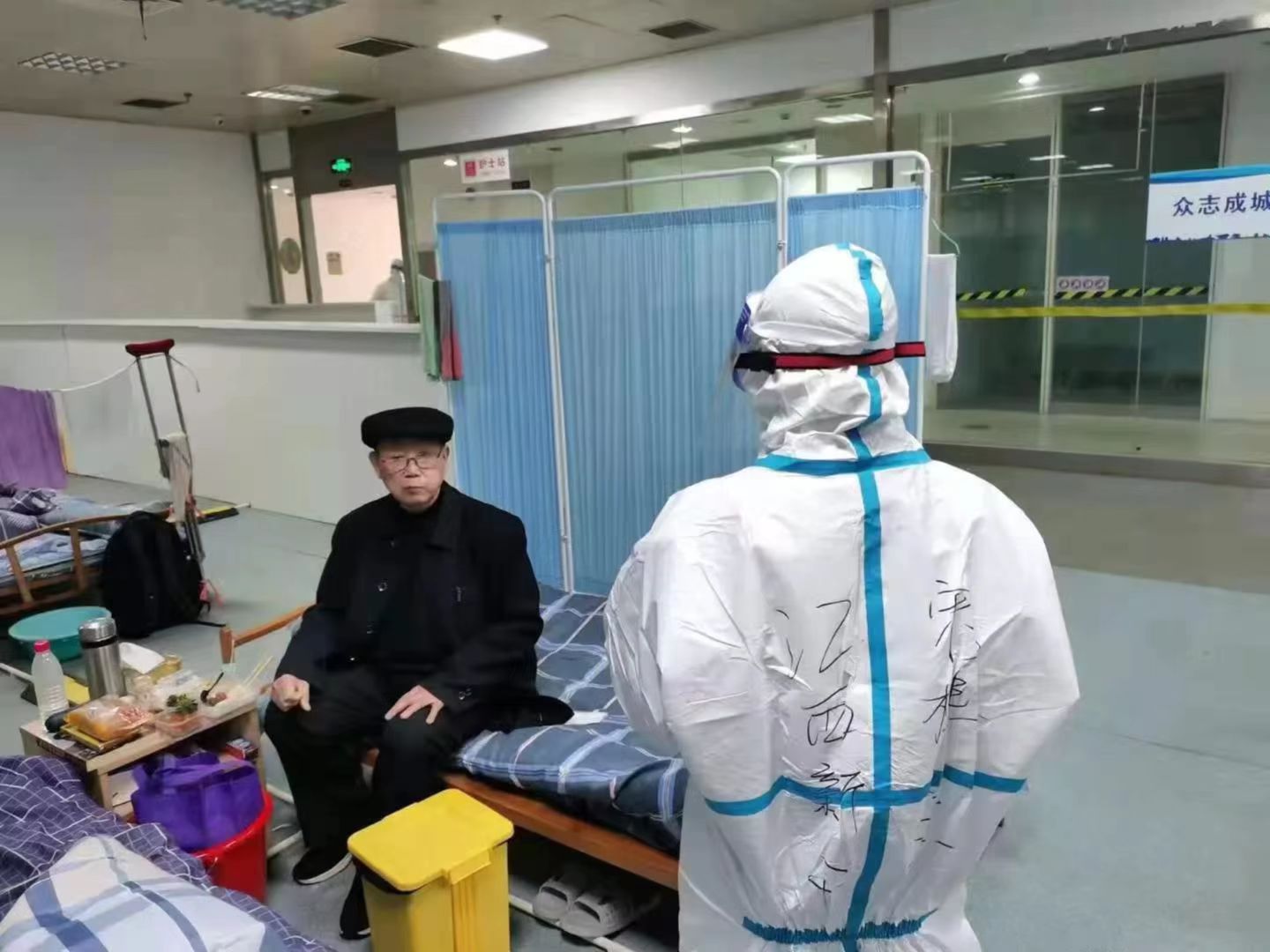 “老吾老以及人之老”,期间有一起很特殊的情况,常先生一家人全都感染收治在本方舱,他的老父亲已经92岁,全家人非常恐慌。得知情形,我觉得有必要对他们尤其是92岁的老人额外照顾一些。做好了安抚工作,常先生一家的担忧也转变成了信心,最终其全家都顺利健康出舱。