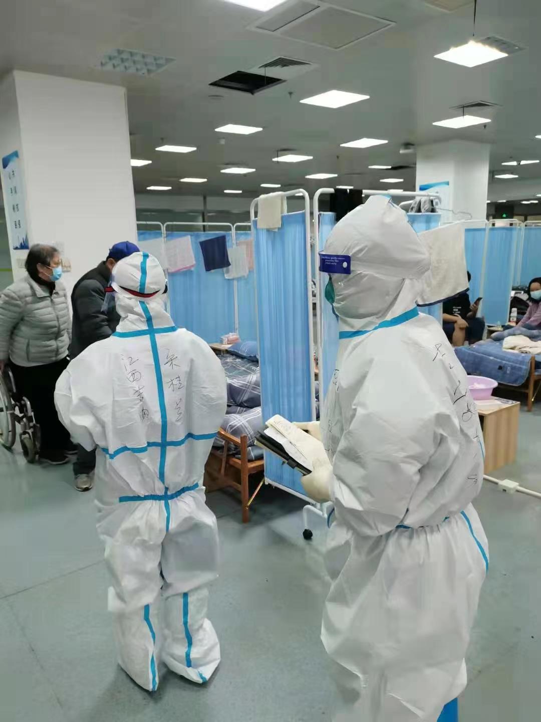 “枕戈待旦”,4月17日凌晨2点全队赶往方舱,我们组的工作是夜班。在连续几天的30多度的高温下,在全密闭的防护服里,每个人都被汗水反复的浸透。工作环境很恶劣,工作任务也很重。接手时,两栋六层舱共1000多名患者,人手的紧张、形势的不明都在加重我们的身心疲惫。可是面对着1000多名患者,身为组长我要对自己有信心,也要给队员们加油鼓劲。舱内患者人数最高峰时甚至达2800多人。全队分工,紧密合作,细心询问每一位患者病史、监测生命体征、密切关注患者的情绪并及时做好安抚,解决患者的困难与需求,确保治疗工作的高质量运转。