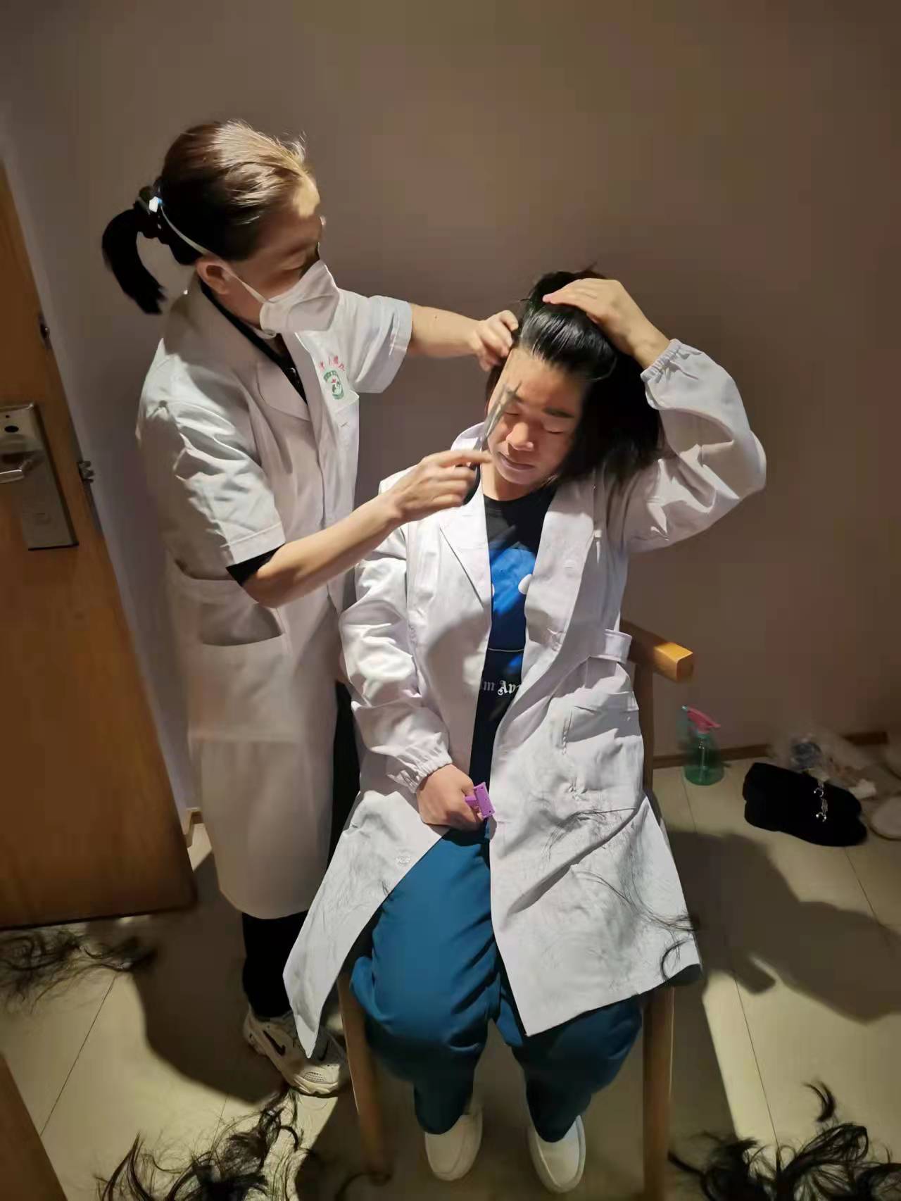 此行队伍七人,包括我在内共有六名女性。抵达上海的第一夜,望着窗外灯火阑珊,我挂掉给家里的报平安电话。有人说头发是女人的第二张脸,即将迎战,六名女性都在为进方舱做着充足的准备。让队友先给我剪掉了长发后,拿妇产科手术刀出身的我用剪刀帮着其余五人都修剪成了短发。巾帼何以让须眉!