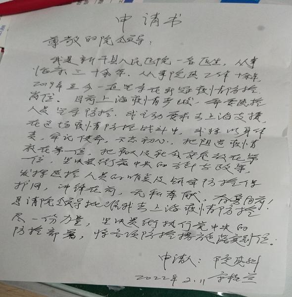 4月11日,接到医院关于组建第二批援沪医疗队的消息,得知上海此时急需院感医生,我第一时间请缨赴沪。申请得到批准,县卫健委指派我为本次新干县援沪医疗队队长。临行前夜,和读高三下晚自习刚回家的儿子说:“妈明天就要去上海支援抗疫,你觉得怎么样?”没想到儿子不加思索的说:“老妈,放心地去吧!我会自己管好自己,高考我会全力以赴,我等你早点平安回来陪我参加高考!”听完儿子的话,转身继续收拾行囊时我眼泪已经忍不住的流,心有愧疚,疫情三年了,儿子高中也第三年了……