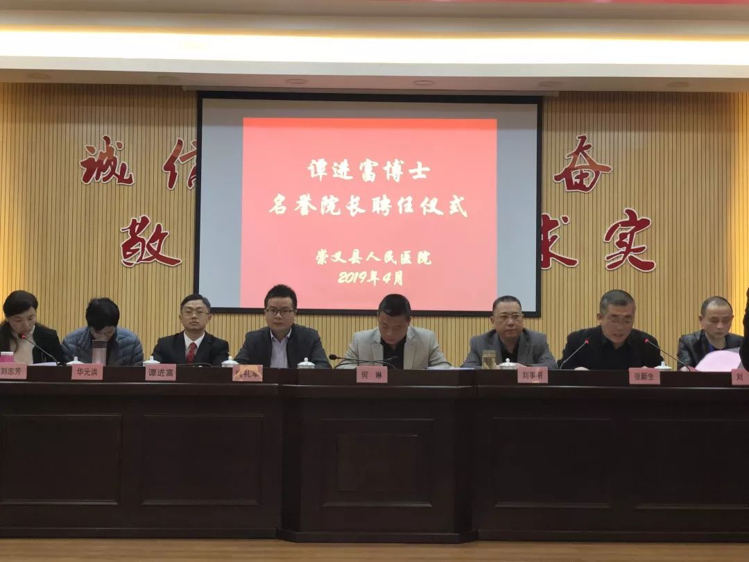 为加强崇义医学事业高层次人才队伍建设,搭建与发达地区医疗资源交流学习平台,学习借鉴发达地区在医院管理理念、前沿医学、创新技术、学科建设等方面的宝贵经验,推动我县医疗事业高质量跨越式发展。经医院研究并报告上级领导同意,决定聘请中山大学附属第一医院谭进富博士为崇义县人民医院名誉院长。4月12日下午,县人民医院在学术报告厅举行了隆重的聘任仪式,县委常委、宣传部部长何琳,县政协副主席、人民医院院长刘事明,县委组织部副部长肖礼军同志参加了聘任仪式。县人民医院领导班子全体成员及组长以上干部、业务骨干代表一百余人参加了此次活动。