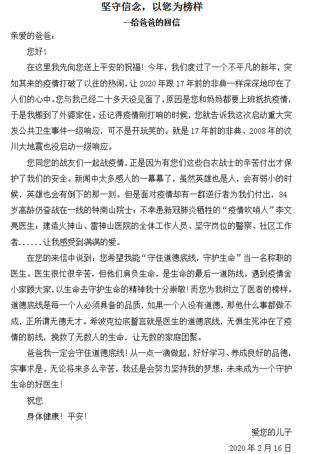 儿子晚上好!今年是一个特殊的年,突如其来的疫情打破了我们平静的生活,我们已经二十多天没有见面了。今天是周末借此机会爸爸给你写一封信,告诉你爸爸这段时间在做什么事情。年初二医院召开紧急的新冠状病毒肺炎的防控会议后,爸爸一直都在上班,坚守在岗位上,做好本职工作,让驰援武汉的同事们安心地在战役的最前线工作。这段时间我了解了许多关于疫情的信息,相信你在电视上已经对新型冠状病毒疫情有了一些了解。爸爸的同学、同事还有同门,他们有很多人都离开了家庭,离开了自己的家乡奔赴了--武汉,这是疫情最重的地方。在武汉他们看到了很多很多,但是他们释放出来都是正能量。我把我的一些体会告诉你:做人做事必须要有道德底线,守住我们的初心。爸爸的同学、同事、同门都是医护人员,因为他们守住道德底线,所以他们毫无怨言地奔向了武汉前线。面对突如其来的疫情,他们心里也会害怕。他们跟爸爸一样有家庭,都是家庭的主心骨,有孩子、有妻子或丈夫、有父母。他们的心情是无比沉重的,面临的这种疫情,只有我们医护人员才能消灭它,所以我们必须上一线。在前线的同学、同事们跟爸爸说,他们在进入隔离病区的前一刻还是有恐惧的心理,但是随着对危重病人的救治,他们已经忘我的工作了。其中爸爸的两个同学分别是中山医院和珠江医院的重症医学科的医生,他们告诉爸爸在那里的重症病房是不可想象的,从来没遇到过这样的情况。他们倾尽所能帮助这些病人,不忘自己的职业信仰和职业道德,甚至动用了母校中山大学的校友资源,为这些病人筹集很多的抢救包、氧气等物资。医生是生命最后一道防线,是死亡前的最后一根稻草。他们说如果我们这一根草都腐朽了,那生命会是怎样呢?我们要守住自己的道德防线。在很多场合下你可以听到德才兼备这个词,在这里就能够体会到才必须在德的基础上才能发挥出来的,有才无德你的才没有用武之地,爸爸希望你做一个守住道德底线的人。