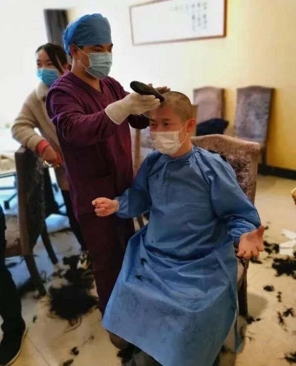 1月28日晚,接受完培训的医护人员们为了方便打理和减少感染风险,主动要求剪发。ICU护士蒋孔明临时充当理发师。一把简单的电动理发刀帮七十多位战友剪完了头发,统一的发型——寸头,都成了最美的人!大家称蒋孔明为“Tony蒋”,而蒋孔明却自称为“美丽终结者”。