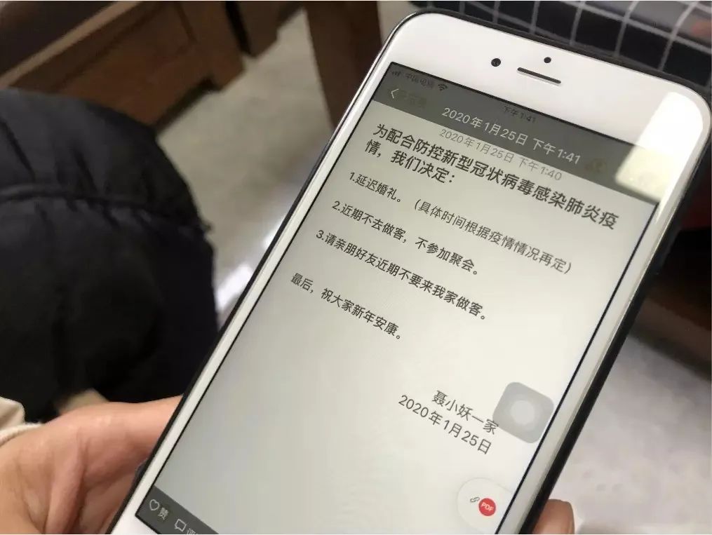 农历大年初一,聂金晶就在微信朋友圈发布了一条婚礼延期的消息,并通过电话、短信等多种方式,告知亲朋好友这件事。聂金晶说:“现在应该说是众志成城,取消休假之后,大家统一上班,大家也没有什么怨言,特别是我认为自己作为一名党员,更应该起表率作用,为其他同事分担一些”。