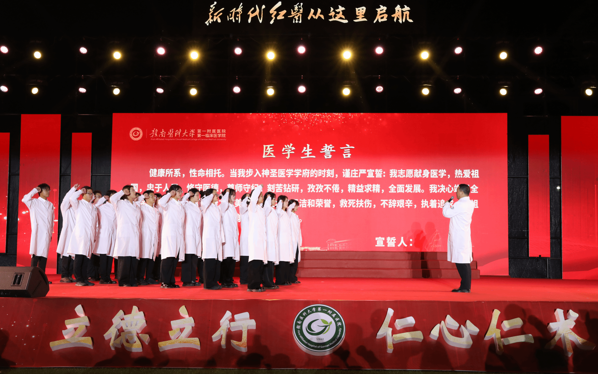 在陈懿建的带领下,宣誓代表与全体新生举起右拳庄严宣誓,铿锵有力的誓言回荡在田径场上,既是对医学事业的郑重承诺,更是红医精神的代代传承。