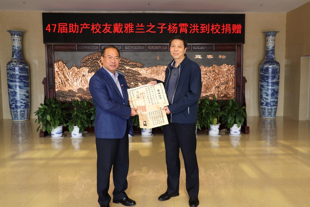 “母校情,永远情!”11月4日,1947届校友戴雅兰之子杨霄洪先生、孙女杨博文女士风尘仆仆从杭州来到赣州,专程向学校捐赠老校友戴雅兰女士珍贵个人资料。学校党委副书记、校长刘潜会见了杨霄洪一行,党委委员、副校长叶军明代表学校接受捐赠,并回赠纪念品以表达感谢和敬意。学校党委委员、统战部部长、赣南医学院校友会会长赖传景,招生与就业管理处(校友联络办公室)等负责同志参加捐赠仪式。